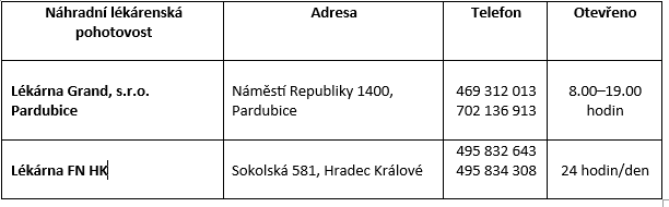 Ve čtvrtek 29. září bude lékárna pro veřejnost uzavřena po celý den. Pohotovostní službu zajistí po dobu omezení lékárna v přízemí Paláce Pardubice na Masarykově nám. 2799 (otevřena do 21 hodin, tel. 225 574 653), po 21. hodině pak lékárna Fakultní nemocnice Hradec Králové (Sokolská 581, HK; tel. 495 832 643, 495 834 308), která je otevřena nepřetržitě.