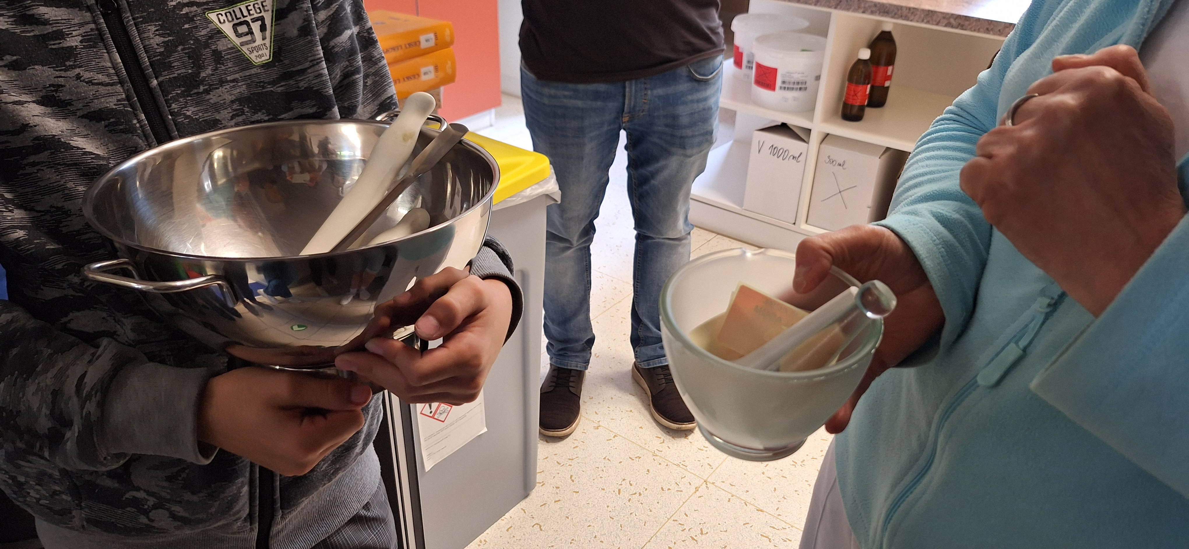 Vedoucí lékárny Vlasta Spurná ukazuje žákům laboratoř, ve které sedí dvě farmaceutky: „V lékárně totiž nejen léky vydáváme, ale některé i sami vyrábíme. Jsou to třeba různé masti, nebo léky v tobolkách. Máme na to vybavení včetně velmi přesných lékárnických vah,“ řekla a názorně ukázala, jak v malém speciálním přístroji léky ve formě kapslí dělají. Každý školák si mohl jednu prázdnou želatinovou tobolku vzít.