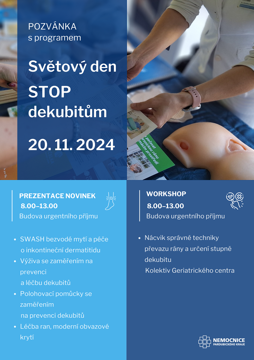Mezinárodní den Stop dekubitům připadá v tomto roce na 21. listopadu. Jeho cílem je vyzdvihnout problematiku dekubitů, které způsobují komplikace pacientům v nemocničním i domácím prostředí. „Proleženina je označení pro poškození kůže nebo tkání kůže, které vzniklo v důsledku mechanického zatížení. Nejvíce jsou ohroženi lidé, kteří jsou dlouhodobě upoutaní na lůžku nebo vozíku beze změny polohy, také imobilní pacienti se sníženou citlivostí (např. diabetici) i lidé po cévní mozkové příhodě,“ upřesňuje manažer ošetřovatelské péče Nemocnice Pardubického kraje Oldřich Hošek. Proleženiny se špatně hojí a v nejhorším stádiu dochází k odumření postižené tkáně. Nejčastěji se tvoří na místě tlaku přímo proti kosti, tzn. v oblasti nad křížovou kostí, na patách, sedací kosti, v oblasti kyčlí a vnějších kotníků.
