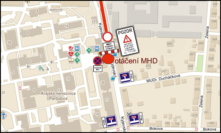 Pro automobily bude ulice Kyjevská uzavřena u hlavní vrátnice. Před ní se budou otáčet autobusy městské hromadné dopravy. Ke spodní vrátnici bude vjezd vozidlům nadále umožněn. Obousměrná objízdná trasa pro automobily povede po Dašické a Staročernské ulici na Černou za Bory a odtud, po odbočení na kruhovém objezdu, po Průmyslové ulici až k její křižovatce s Kyjevskou ulicí. Pacienti musí počítat se změnami v parkování v okolí nemocnice, například část Východní ulice podél areálu Tesly, přiléhající k nadjezdu, bude uzavřena. Zákaz zastavení i stání bude po dobu rekonstrukce platit i v ulici Ke Kamenci, kterou budou projíždět vozy městské hromadné dopravy.