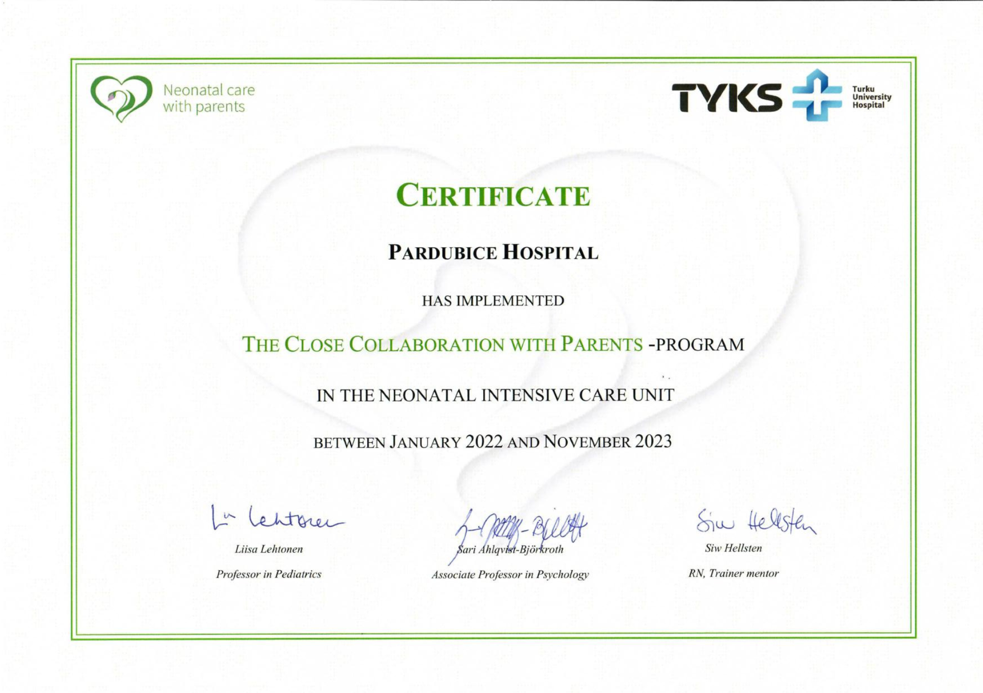 Myšlenka změnit přístup k péči nedonošených dětí tedy vznikla původně ve Finsku. Do praxe ji uvedla finská lékařka profesorka Liisa Lehtonen společně s psycholožkou Sari Ahlquist Björtkroth, která stojí za propracovaným programem mentoringu.  „Spolupráce s českými kolegy byla výborná, v Pardubické nemocnici odvedli skvělou práci,“ uvedla Liisa Lehtonen, která nechyběla na závěrečném semináři projektu.